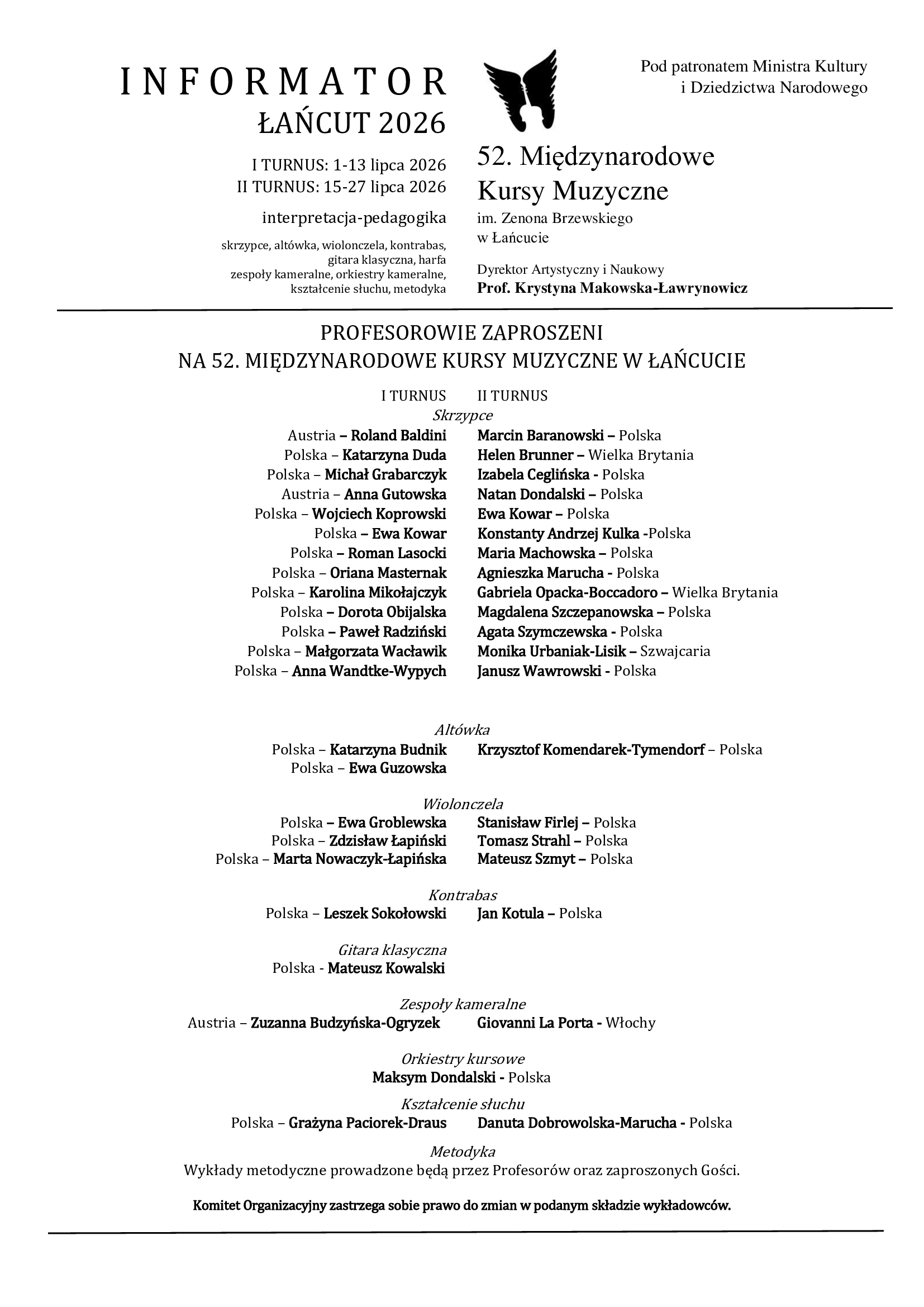 Z ogromną przyjemnością przedstawiamy Państwu Profesorów zaproszonych na 52. Międzynarodowe Kursy Muzyczne im. Zenona Brzewskiego w Łańcucie.