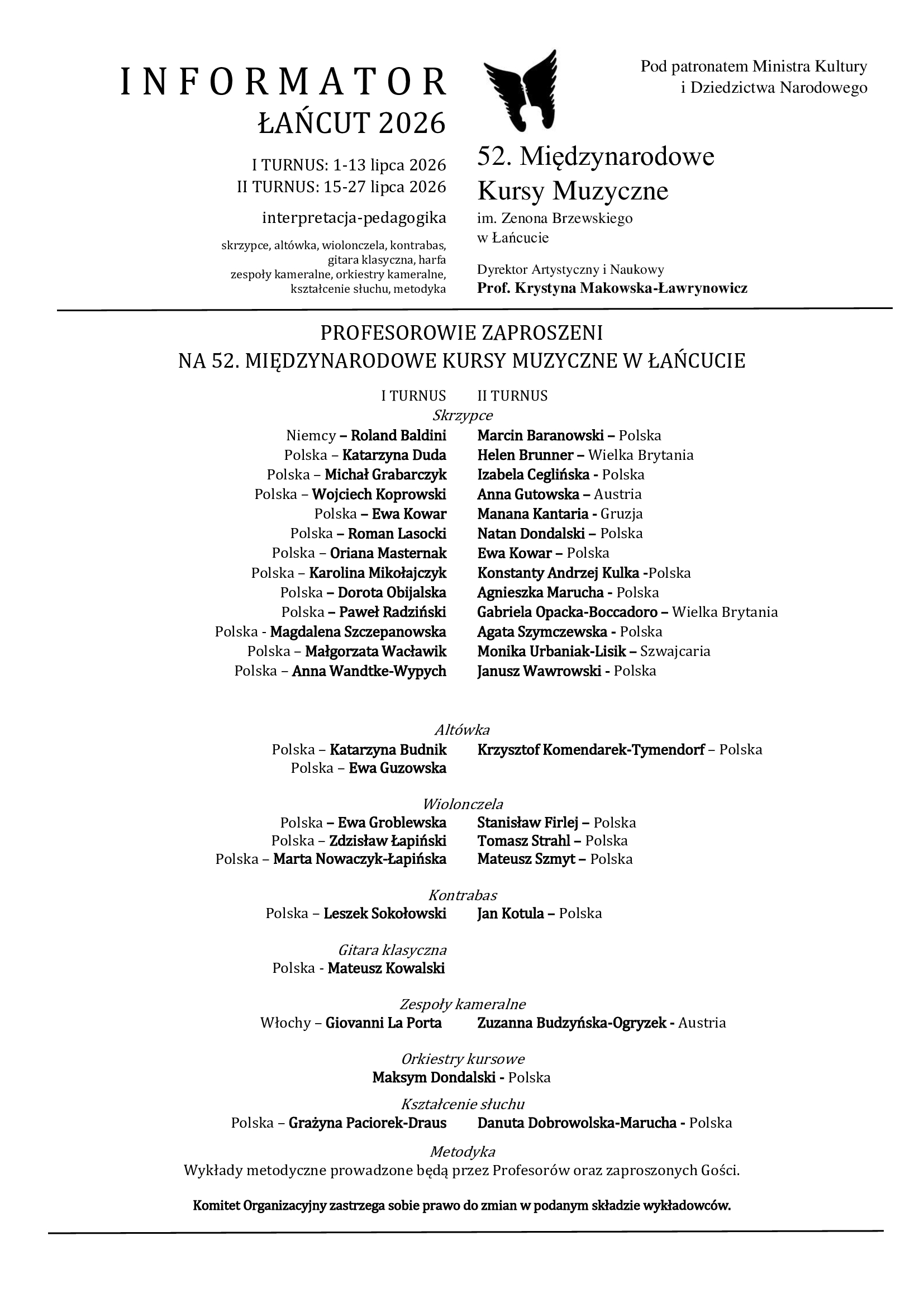 Z ogromną przyjemnością przedstawiamy Państwu Profesorów zaproszonych na 52. Międzynarodowe Kursy Muzyczne im. Zenona Brzewskiego w Łańcucie